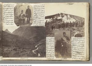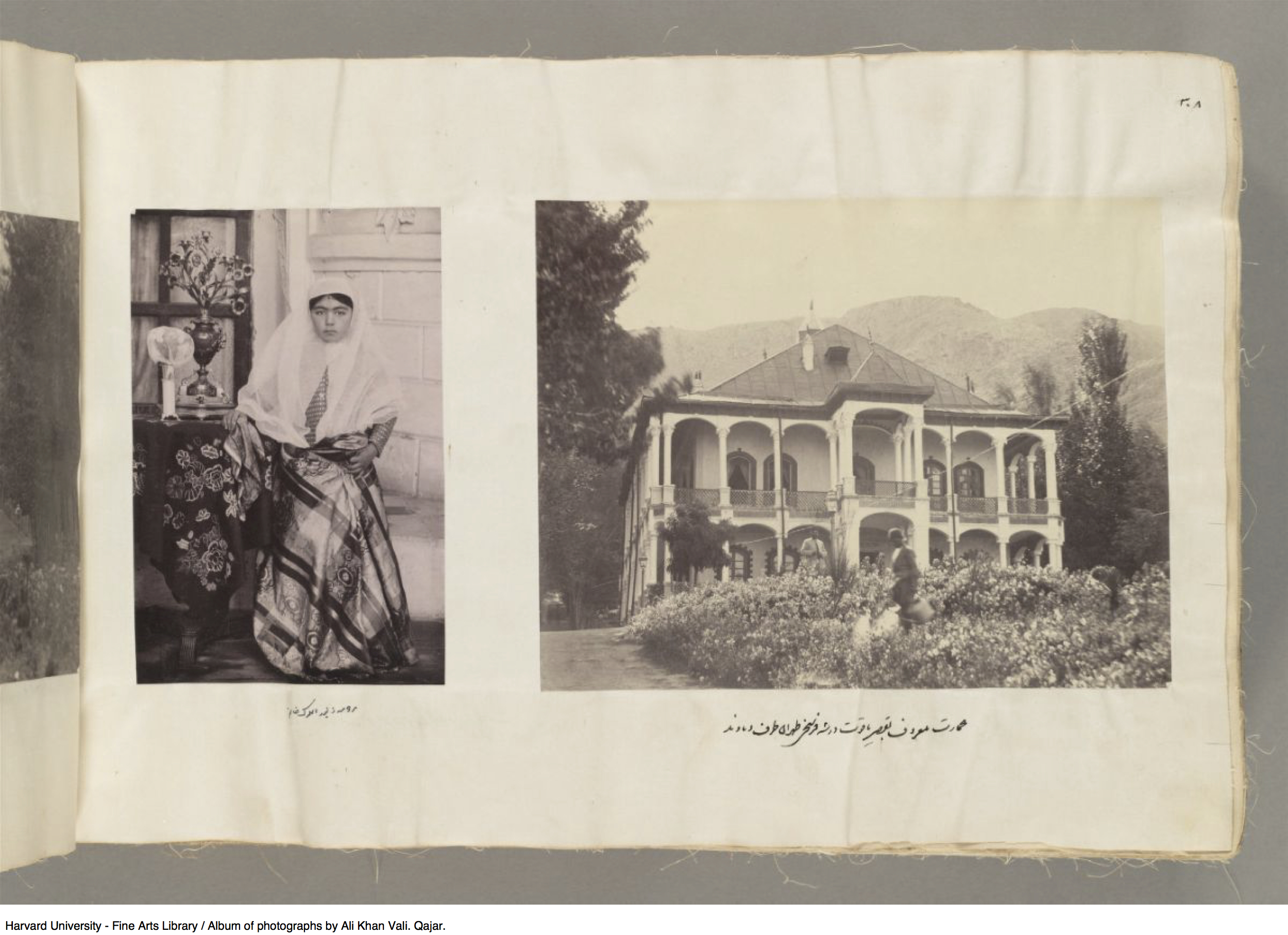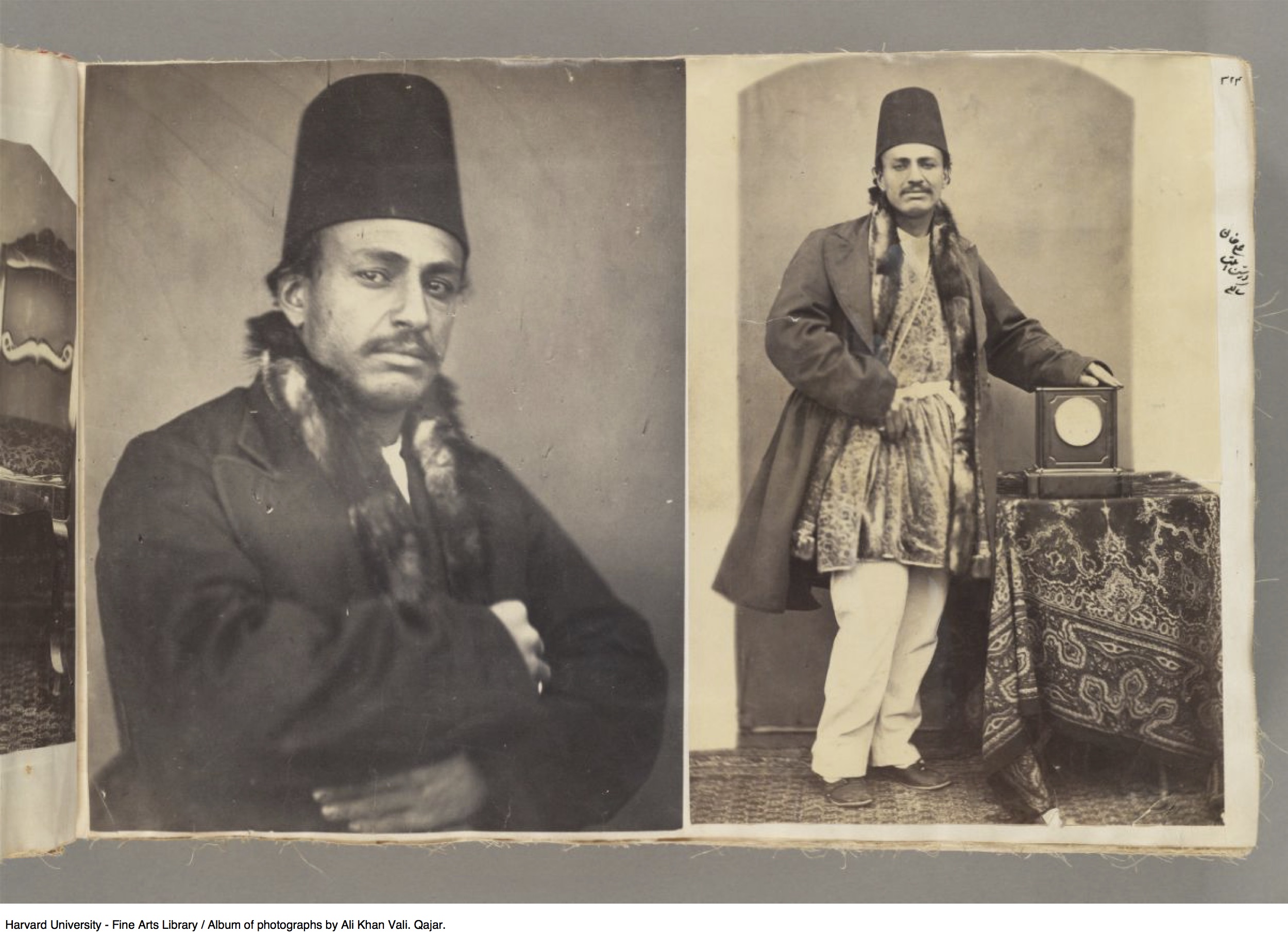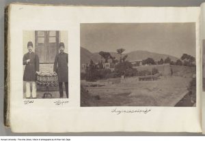Bibliographer in Islamic Art and Architecture in Fine Arts Library, András Riedlmayer, provided the following biography on Ali Khan Vali: `Alí Khán, son of Mohammad Qásem Khán Válí, son of Dust `Alí Khán Mo`ayyero’l-mamálek, was born in Tehran in 1262 Hijri qamari (1846), `Ali Khan accompanied his father, a diplomat, to Saint Petersburg in 1855 — where he studied French and learned photography at the Russian imperial court. From 1296 Hijri qamari (1879), when he was named governor of Marāgheh, until ca. 1900, Ali Khan held a series of posts in the region of Azerbaijan, as the governor of Orumiyeh, Khoy and Ardabil and as mayor of Tabrīz. During this period he illustrated his reports to the government in Tehran with photographs. He also kept a personal archive of the many photographs he took himself or photographs by others that he collected, in a massive album that has been preserved in the possession of his family. `Alí Khán Válí died in 1902 and was buried in Qum